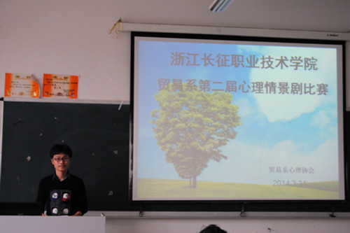 2014年3月31日晚,贸易系第二届心理剧大赛在教学楼1402举行。贸易系团总支书记严雪娟老师、心理协会成员以及学生会主席团出席了本次大赛并担任评委。